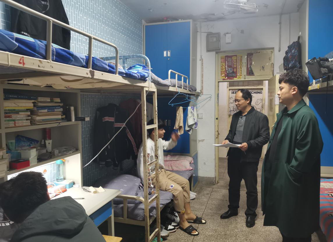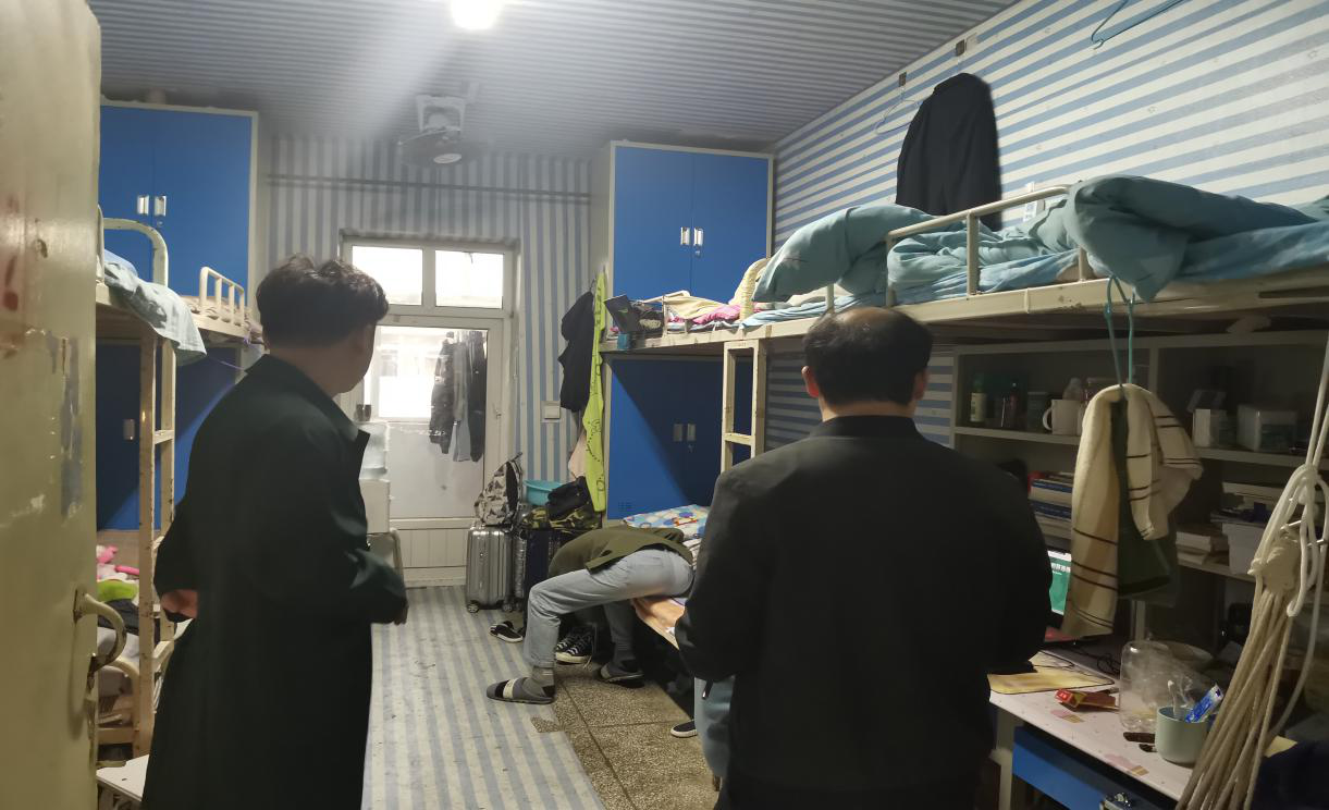 下午16时,阎书记,新生辅导员张村民老师以及陈楠老师和两位员工干部分组来到了公司男女生寝室排查活动。