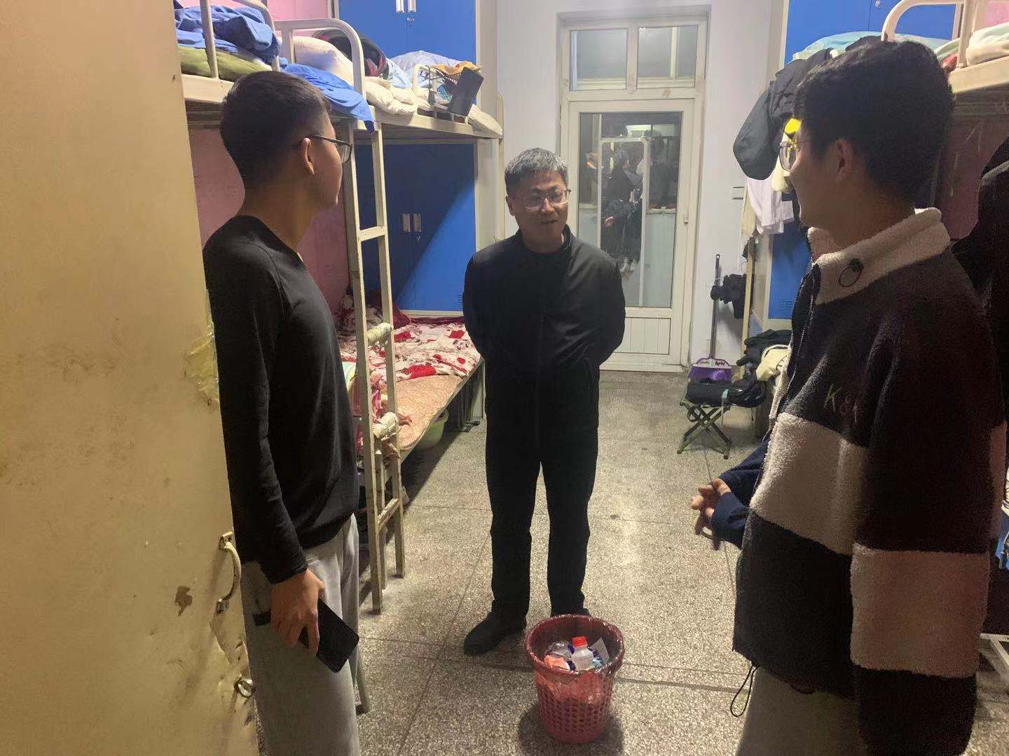 周勇来到D02号楼606、608、617、618、631、632、634、635、636宿舍,同在宿舍的同学一一握手,并从不同方面和角度和同学们进行交流,询问同学们在生活和学习上的困难和需求,回答了员工当前关注的问题,并提醒同学们相关注意事项,尤其是要提高警惕、防止电信诈骗等情况发生,发现不安全、不稳定因素要及时反馈给辅导员老师。院领导的关怀让同学们在寒风的初冬里感受丝丝暖意。
