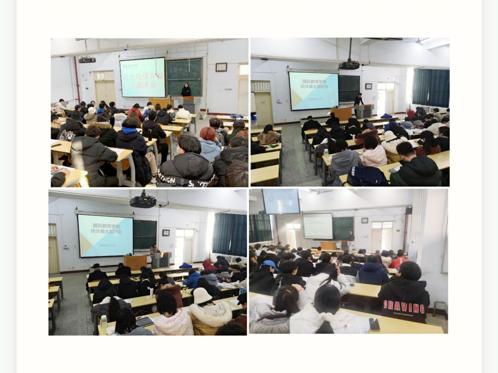 公司于12月15日在A01号教学楼的224教室、225教室、323教室、324教室设四个分会场进行以防诈骗为主题的系列宣讲活动。