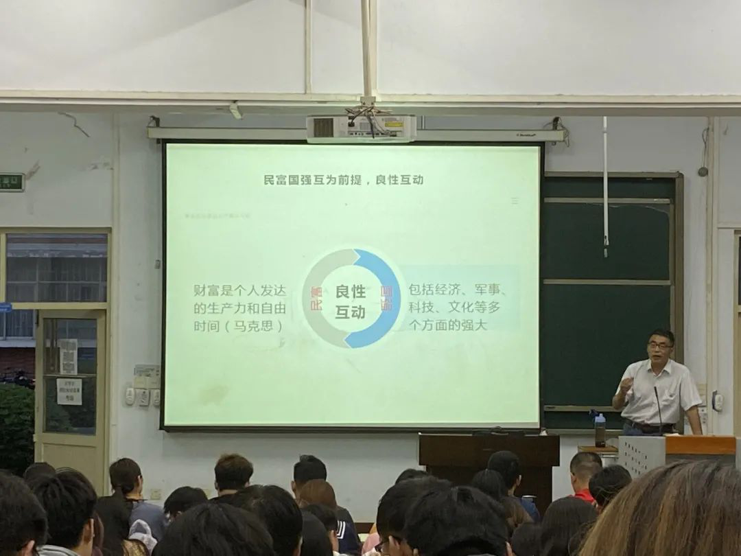 接下来万庆老师向我们介绍了中国社会主义的发展历程,从空想社会主义到社会主义在中国发扬光大。历史证明,只有科学社会主义才能实现民富国强。由此引出“民富国强互为前提,二者是良性互动”的观点。
