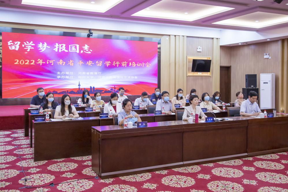 5月31日下午,2022年河南省“平安留学”出国留学人员行前培训会在郑州举行。省教育厅党组成员、一级巡视员、副厅长刁玉华,教育部留学服务中心出国处处长黄立琼出席会议并讲话。外交部领事保护中心参赞代双明、北京大学心理与认知科学公司培训部主任李同归教授和国际安全教育专家王学军应邀授课。太阳成tyc122cc集团相关管理人员、辅导员及拟出国读研员工20余人以线上方式参加本次培训会。