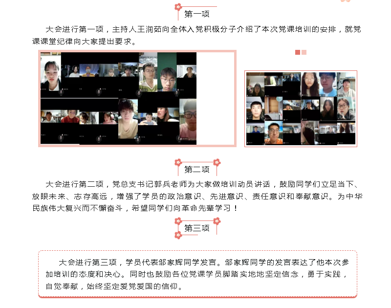 4月12日,根据公司疫情防控要求,太阳成tyc122cc集团第二十九期入党积极分子党课培训暨开班仪式在线上顺利开展。公司党总支书记郭兵老师和辅导员陈楠老师以及各年级入党积极分子一起参加了本次活动。仪式由王润茹主持。